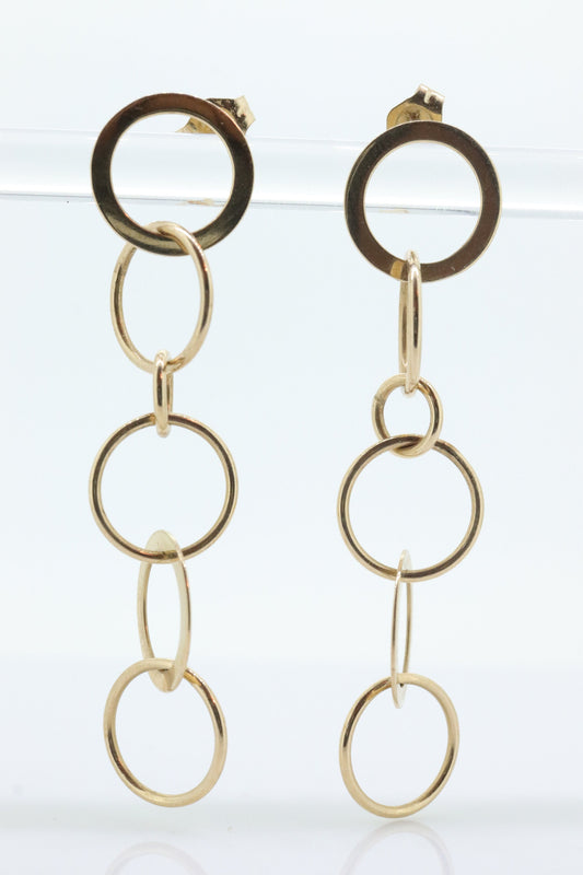 Ohrhänger aus 14-karätigem NABCO-Gold. Ineinandergreifende Kreisscheiben aus 14-karätigem Gelbgold. Kettenglieder-Ohrringe. st(92)