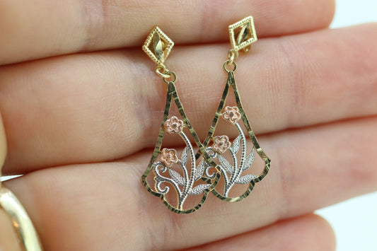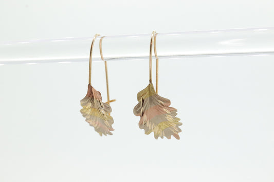 Ohrhänger aus 14-karätigem Gelb-Weiß-Roségold. Blattstrukturierte Ohrringe im Diamantschliff. st(21)