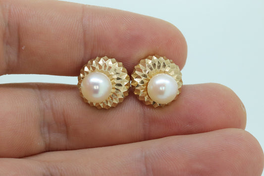 Ohrstecker aus 14-karätigen Perlen mit strukturiertem Hintergrund. Hochwertige Akoya-Perle mit diamantgeschliffener 14-Karat-Textur. Offzentrische Ohrstecker. st(63)