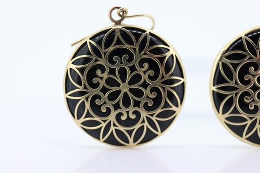 10-karätige filigrane ONYX-Medaillon-Ohrringe. Offene Ohrringe mit Onyx-Scheiben-Blumenmedaillon aus 10-karätigem Gold. Rundes Scheibenmedaillon als Anhänger. st(86)