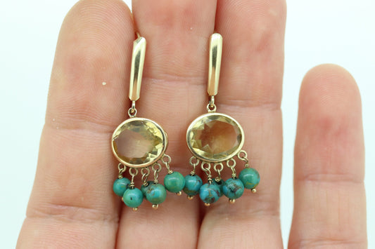 14-karätiges Türkis-Citrin-Ohrhänger-Set. Türkise Citrin-Lünettenohrringe. Gelbgold-Türkis-Ohrringe ST(110)