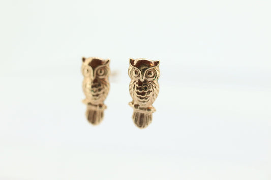 14k Eulen Ohrringe. 3D-weise Eulen-Ohrringe. Kleine zierliche Eulen-Ohrringe aus 14-karätigem Gelbgold. st(70)