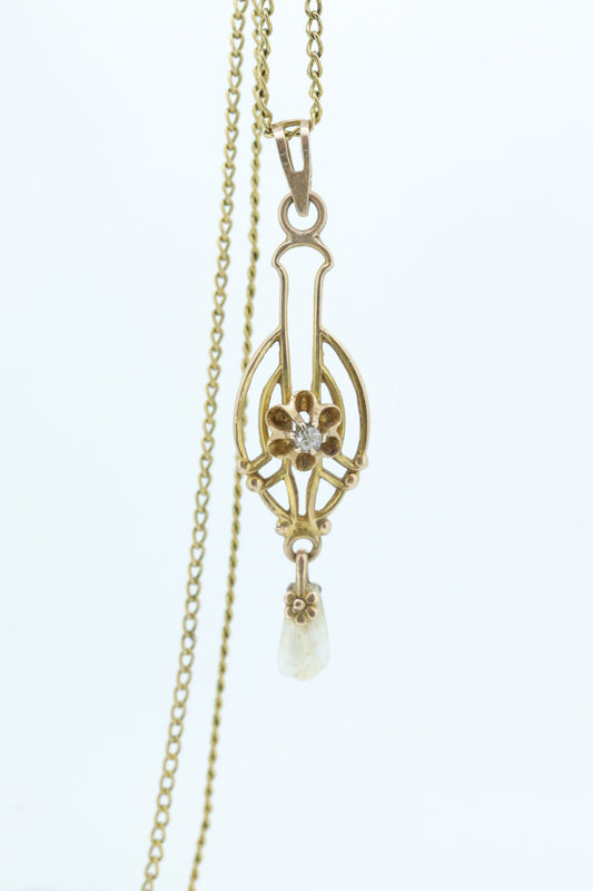 Otsby Barton Diamant-Lavalière-Anhänger. 10-karätiges Gold mit einem diamantbesetzten Anhänger aus Butterblume und Reisperle für eine Halskette. Otsby Barton (st80)