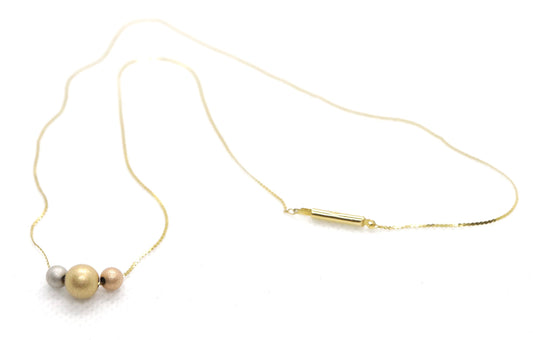 Halskette aus 14-karätigen Perlen. Gelb-Rosé-Weißgold-Perlen an einer S-Gliederkette. Dreifarbige Halskette