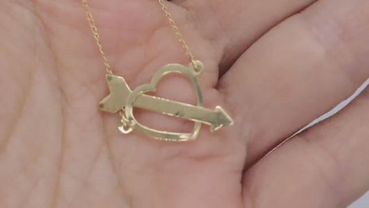 14-karätiger Anhänger mit offenem Herz. 14-karätige durchbohrte Herz-Pfeil-Kabelkette. 1 mm breit und 15 Zoll lang