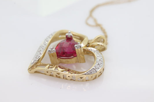 10-karätige Rubin-Halskette mit facettiertem Herz und Diamant. 10k LOVE MOM Anhänger. Als Geschenk für Mama. Lagerbestand(86/25)