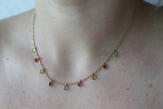 Mehrschichtige Halskette mit 14-karätigen Lünetten-Edelsteinen. Wundervolle, zierliche, baumelnde, mehrfarbige Bonbon-Edelstein-Halskette. Topas, Citrin, Granat st(103/50)