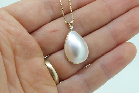 14 Karat großer MABE-Perlen-Diamant-Anhänger. Leslies Schmuckanhänger. Mabe Pearl Drop-Anhänger mit Kastenkette. st(87)