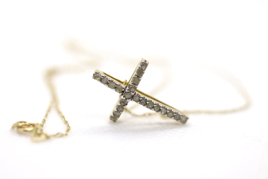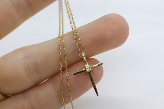 Vintage Kruzifix-Kreuz-Anhänger aus 10 Karat Gelbgold und Diamant. Kruzifix-Kette. Kreuz mit Rohdiamanten. Halskette mit Seilkette.