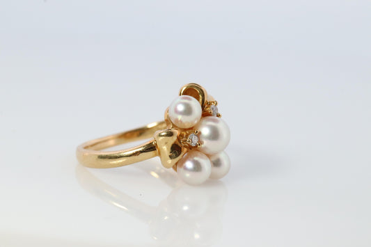 Mikimoto Ring. Vintage 18k Gold Mikimoto Pearl and Diamond Cluster. Vines Grapes