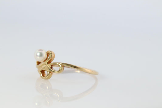 Mikimoto Ring. Vintage 18k Gold Mikimoto Pearl Cluster with Vines Dainty