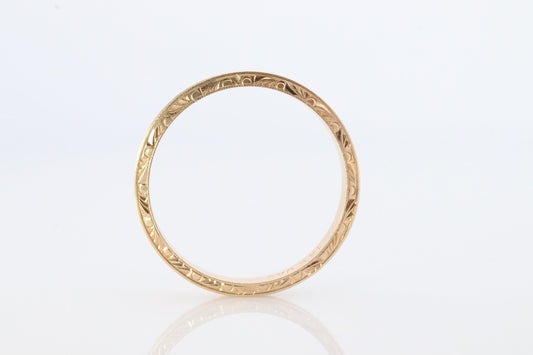 14k graviertes Band. Eisenbahnschienen aus 14-karätigem Gelbgold und Blumen. Detaillierte Gravur an der Seite. Feiner Ring mit handgraviertem Muster. JAC
