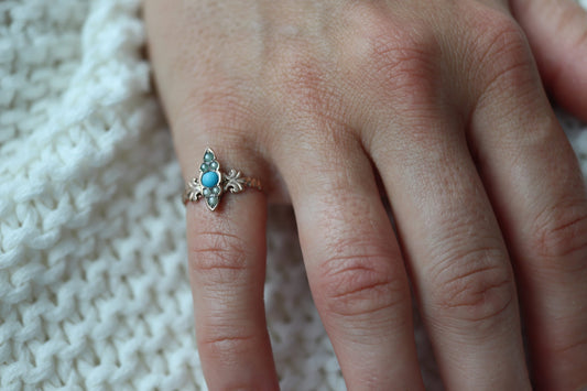 Viktorianischer Ring aus 10 Karat Türkis mit Cabochon und Perlensamen. 10-karätiger viktorianischer, verzierter Lünettenring mit Vine-Prägung. Antiker Navette-Ring.