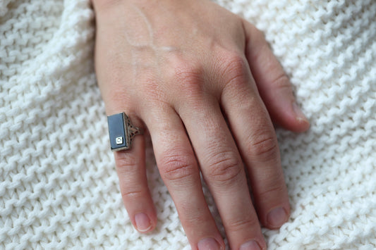 Art-Deco-Ring aus Onyx und Diamant. Rechteckiger Ring aus 14-karätigem Gelbgold mit Onyx und Diamant. Trauerring. Filigranes Weißgold.