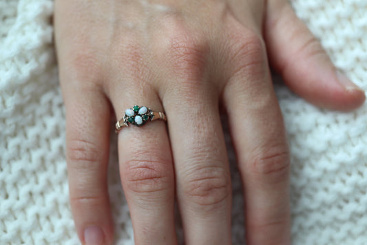 Viktorianischer Opal- und Edelsteinring. Cluster-Ring aus 10-karätigem Gold mit antikem Opal und grünen Edelsteinen.