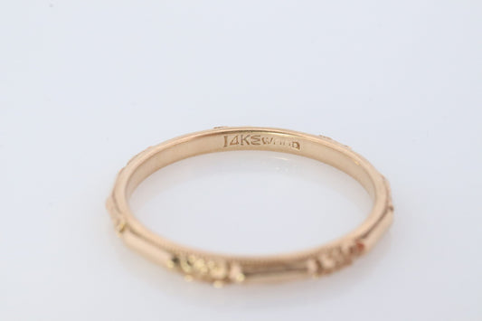 14-karätiges JR-Holz-Art-Deco-Blüten-Blume-der-Liebe-Gravur-Design-Band. Floral Blossom Jr Wood and Sons Ring. 14-karätiges Gelbgold antik.