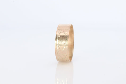 10k breites Zigarrenband. Antikes geprägtes Chevron-Blumenmuster. 6mm SZ6. Antiker breiter hellgoldener Ring.