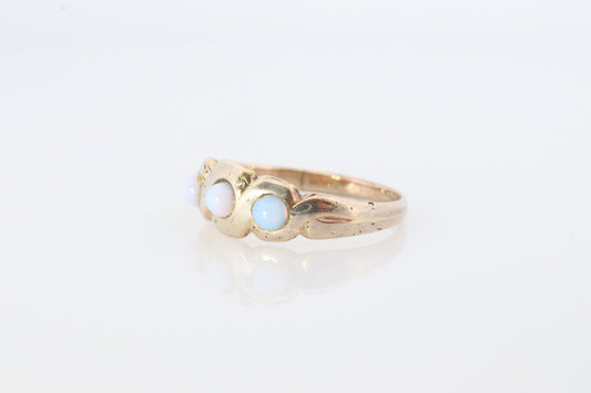 Goldgefüllter viktorianischer Opalring. GF-Gelbgold mit dreifachen Opalit-Cabochons in der Lünette.