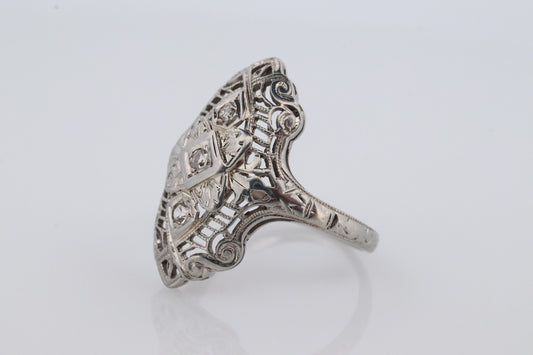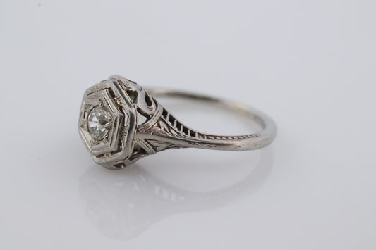 18-karätiger Art-Déco-Diamantring. Filigraner Ring aus 18-karätigem Weißgold. Offener Verlobungsring mit sechseckiger Fassung