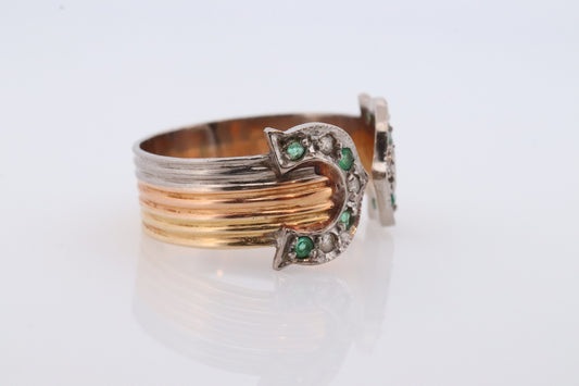 Vintage 18k dreifarbiger offener C-Ring. Gerippter Dreifachring. Diamant-Smaragd-C-Band. 18 Karat breites Diamant-Smaragd-Band.