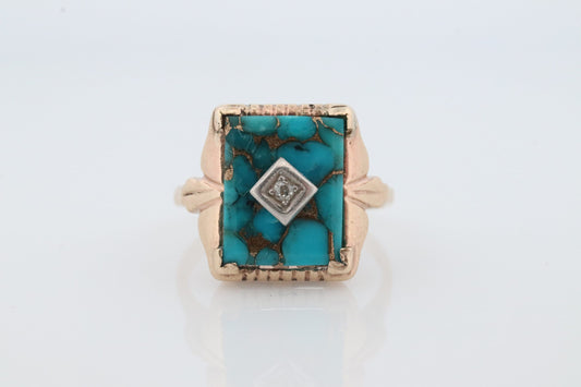 10-Karat-Türkis- und Diamantring. Mehrfarbiger Ring aus Kupferader-Türkis und Diamanten in der Mitte aus Gelbgold. Trauerring Viktorianisch.