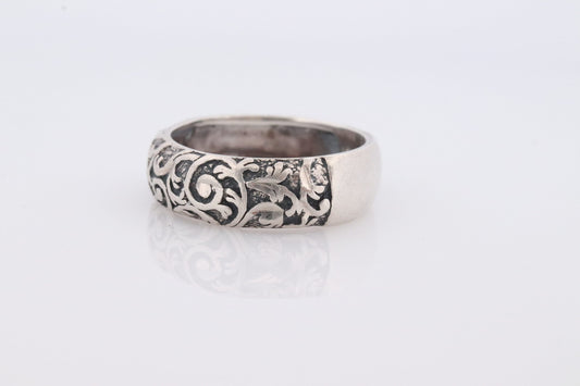 Band mit floraler Gravur. Schweres, breites, graviertes, verziertes Band aus Sterlingsilber. Band mit Blumengravur. Blumenband.