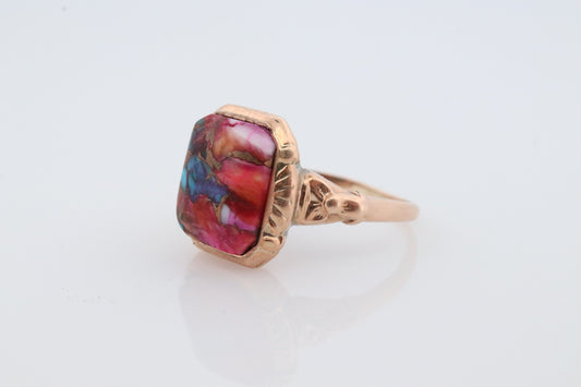 10k DAHLIA-Cabochon-Ring. Kupferader-Türkis und Austern-Collage-Edelstein. Dahlie, mehrfarbiges Juwel.