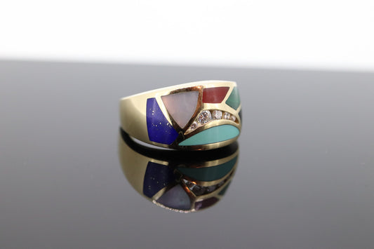 Bagley & Hotchkiss Kuppelring, 14 Karat Gelbgold, eingelegter Edelsteinring, Perlmutt, Lapis-Türkis, Diamantring, St(36-7)