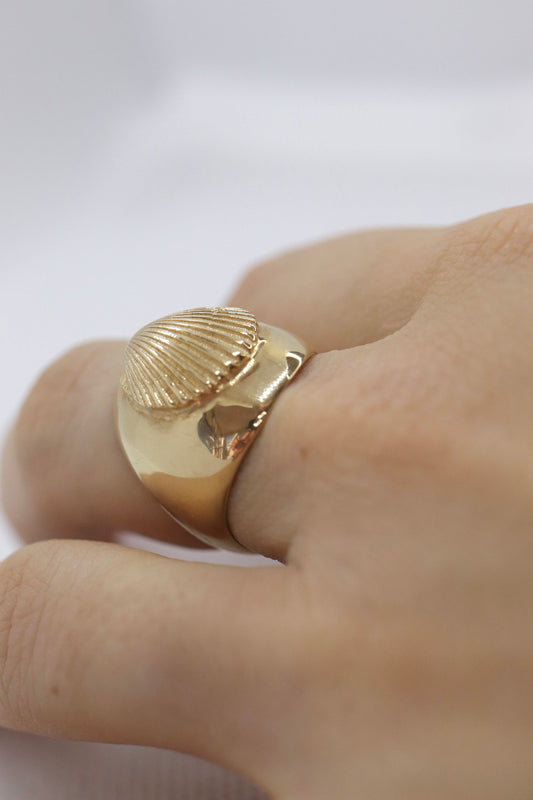 14-Karat-Ring mit schwerer Muschelprägung. Siegelring aus 14-karätigem Gelbgold mit Muschelmuschel, 12 Gramm, Gr. 7,5