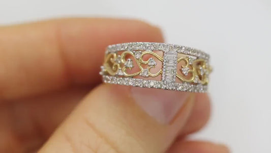 14-Karat-Diamant-Kuppelband. Filigraner Diamant-Ring mit aufwendigen Details. Offener Scroll-Ring. Baguette- und runde Diamanten. M. (126/50)