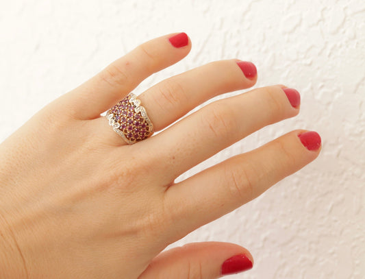 Ring aus 14 Karat Rubin und Diamanten mit breiter Pavé-Verkrustung. Statement-Band aus 14-karätigem Gelbgold und Diamant-Rubin