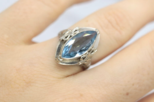 Schweizer Blautopas-Ring. Filigranes Design aus 14-karätigem Weißgold. Art Deco 1920-Ära. Statement-Band. st(173/65)