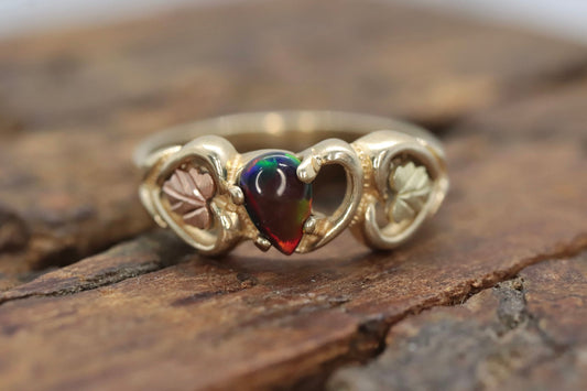 Black Hills Goldring mit Ammolit-Edelstein. 10-karätiges Black Hills Gold Ammolite-Birnenschliff-Band. Vintage Black Hills-Gold. M(71/30)