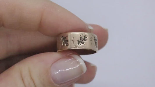 10k breites Zigarrenband. Roségoldenes Vintage-Design mit geprägtem Ahorn-Eichenblatt. 7,5 mm Gr. 6,75