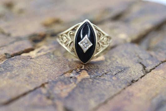 Ring aus 10 Karat ONYX und Diamant. Marquise Onyx Lünette Set viktorianischer Trauerring. PSCO. M(74/75)