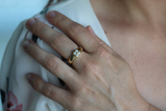 Mikimoto Ring. Vintage 18k Gold Mikimoto Diamond Clover ring. Mikimoto Diamond Cluster band. Mikimoto Flower. Wide wedding band.