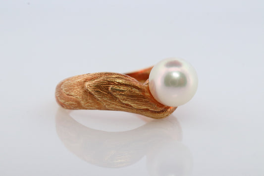 Mikimoto Ring. Vintage 18k Gold Mikimoto Pearl and Diamond Solitaire. Mikimoto Pearl Natural Wood Bark Design. Akoya pearl