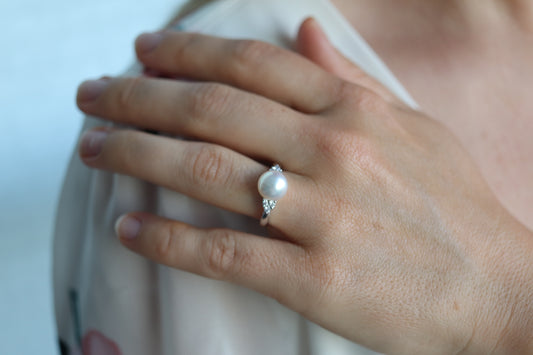 Mikimoto Ring. Vintage Platinum Mikimoto Pearl and Diamond Solitaire. PT950 Mikimoto Large Pearl Ring.