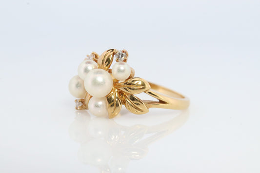 Mikimoto Ring. Vintage 18k Gold Mikimoto Pearl and Diamond Cluster. Mikimoto Pearl Grape Vine Design