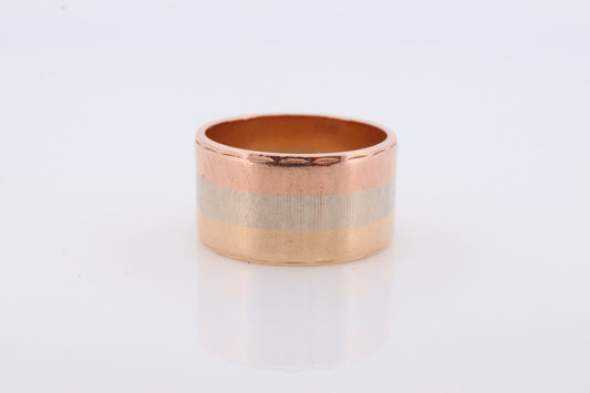 14k breites Zigarrenband. WR&Co Vintage Tricolor Goldring. Weißes, gelbes und roségoldenes Zigarrenband.