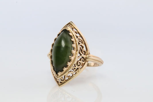 14k Dark Green Jade Jadeite ring. Marquise cut green Jade cabochon ring. Open Filigree Scrollwork ring.