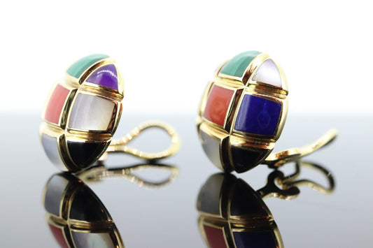 Asch Grossbardt 14K Gelbgold eingelegte Edelstein-Schachbrett-Ohrringe, Perlmutt, Lapiskoralle, Onyx, Malachit, NICHT durchbohrte Ohren st(620)