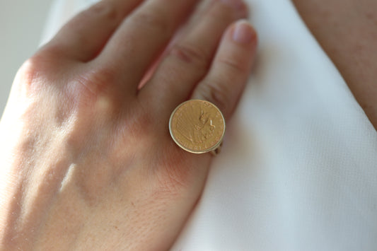 Ring aus 14-karätigem Gold mit einer Lünette aus 22-karätigem 2,5-Dollar-Münzen-Indianerhäuptling von 1908. Lünettensatz Siegelmünzenring.