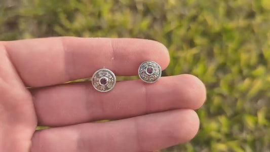 14k Ruby and Diamond Halo Gold Stud Earrings. Vintage Rough cut diamond ruby button round earrings. st(40)