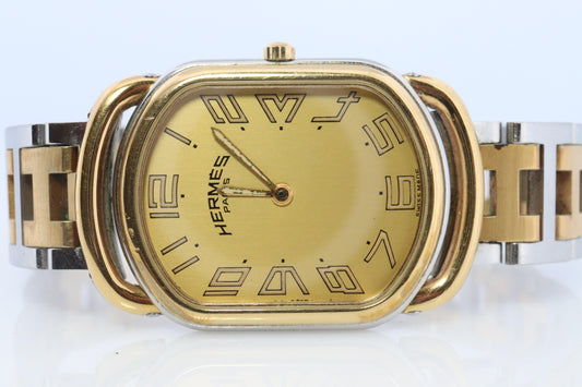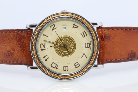 Genuine HERMES Sellier 34mm Round SS and 18k Quartz Hermes SE3.720 Mens Watch