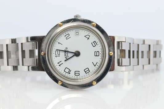 Genuine HERMES Stainless Steel 24mm Round Clipper Quartz Watch White Dial.