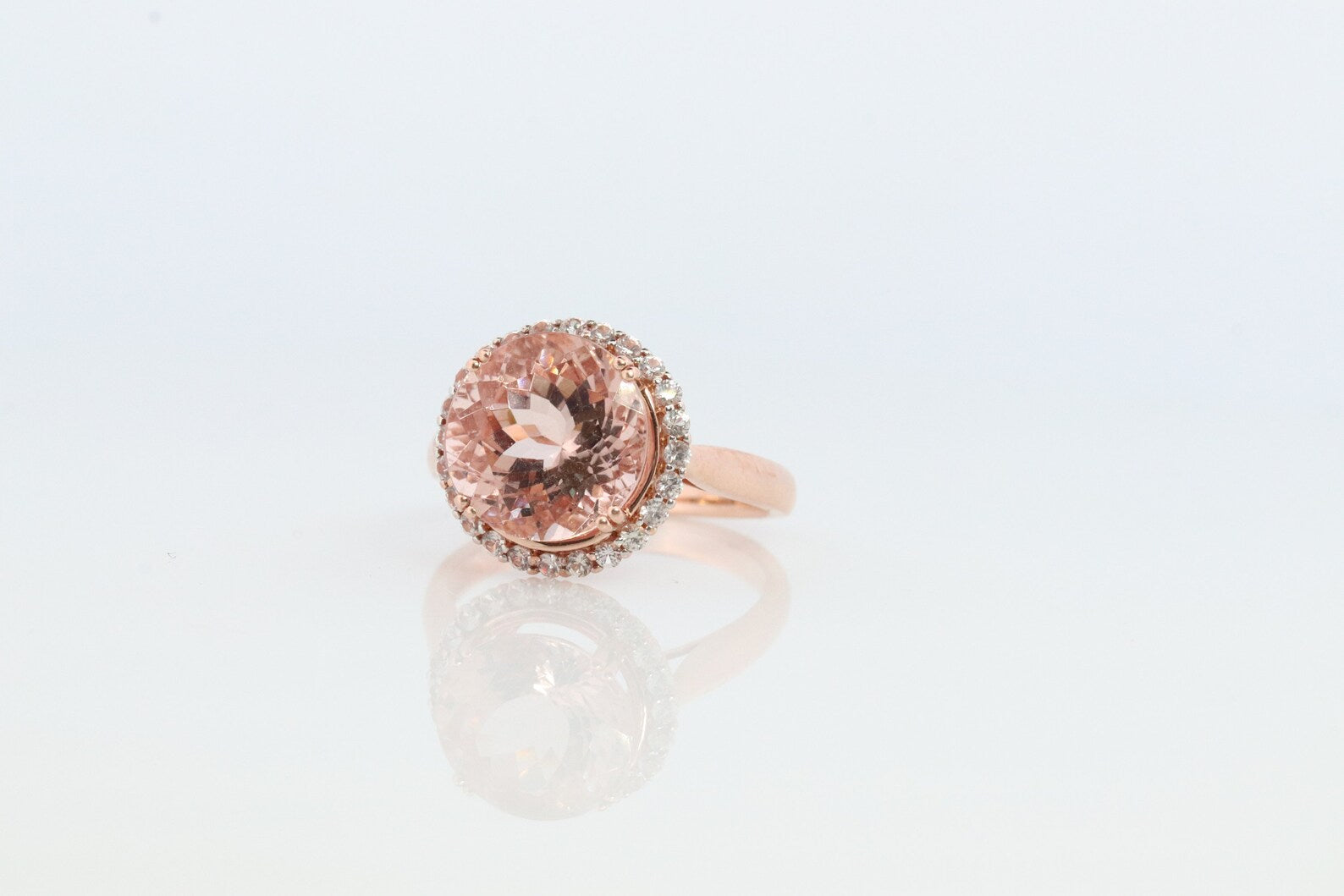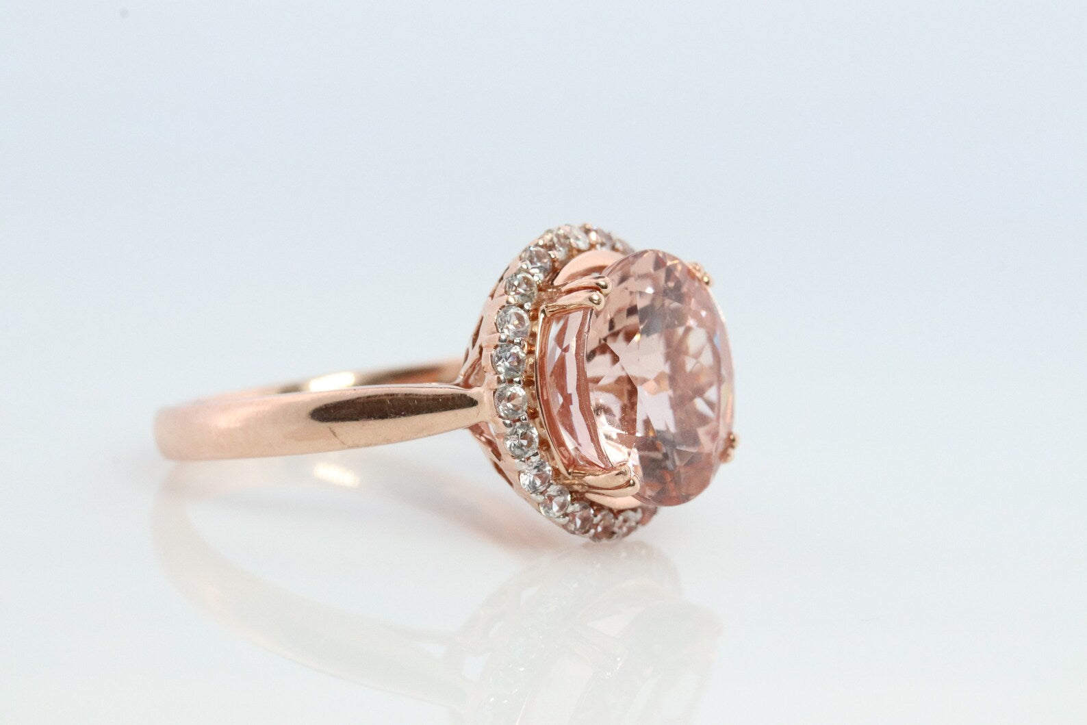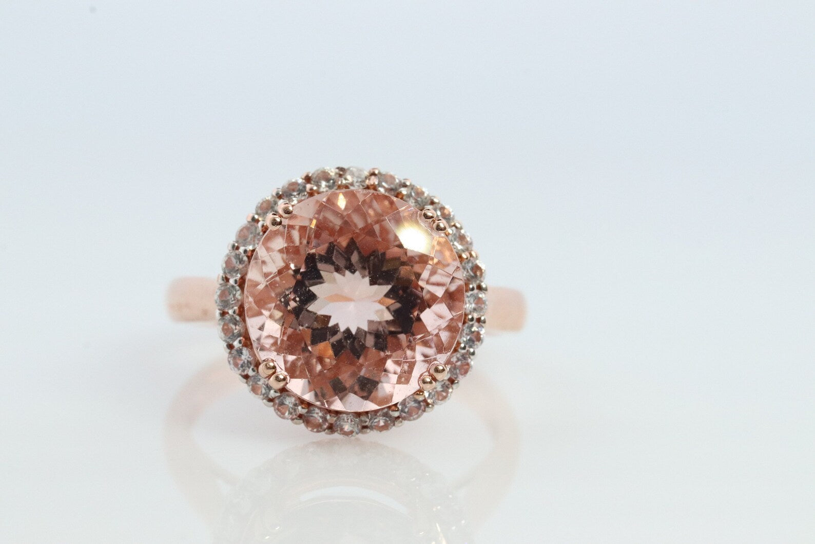 Halo-Ring aus 10 Karat Morganit und weißem Saphir. Runder Halo-Ring aus Roségold mit Morganit und Diamant (weißer Saphir). st(85)