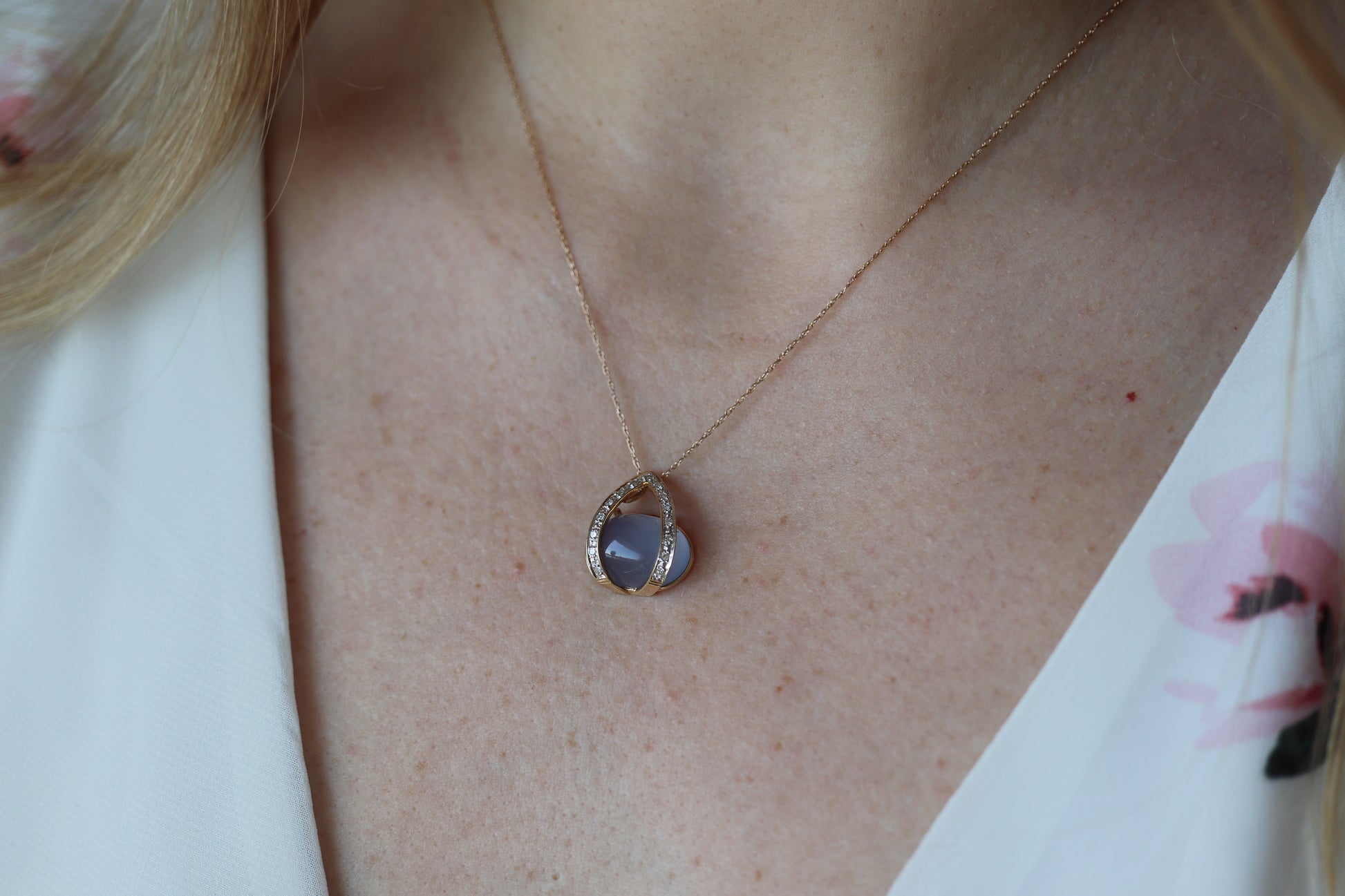 14-karätiger Chalcedon-Cabochon-Diamant-Anhänger. Halskette mit winzigen Diamanten und Lavendel-Chalcedon-Kalzedon