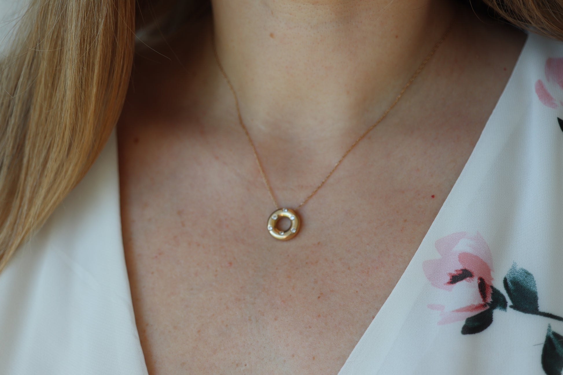 14K Diamant-Kreis des Lebens, offener Kreis, Ewigkeitskreis-Diamantanhänger. Etoile-Halskette mit Diamant-Donut-Scheiben-Anhänger und Lünettenbesatz.