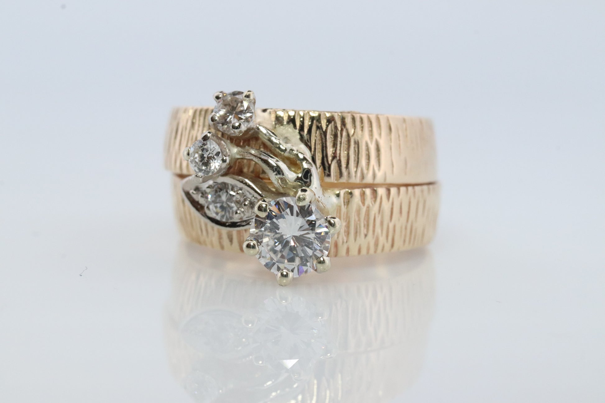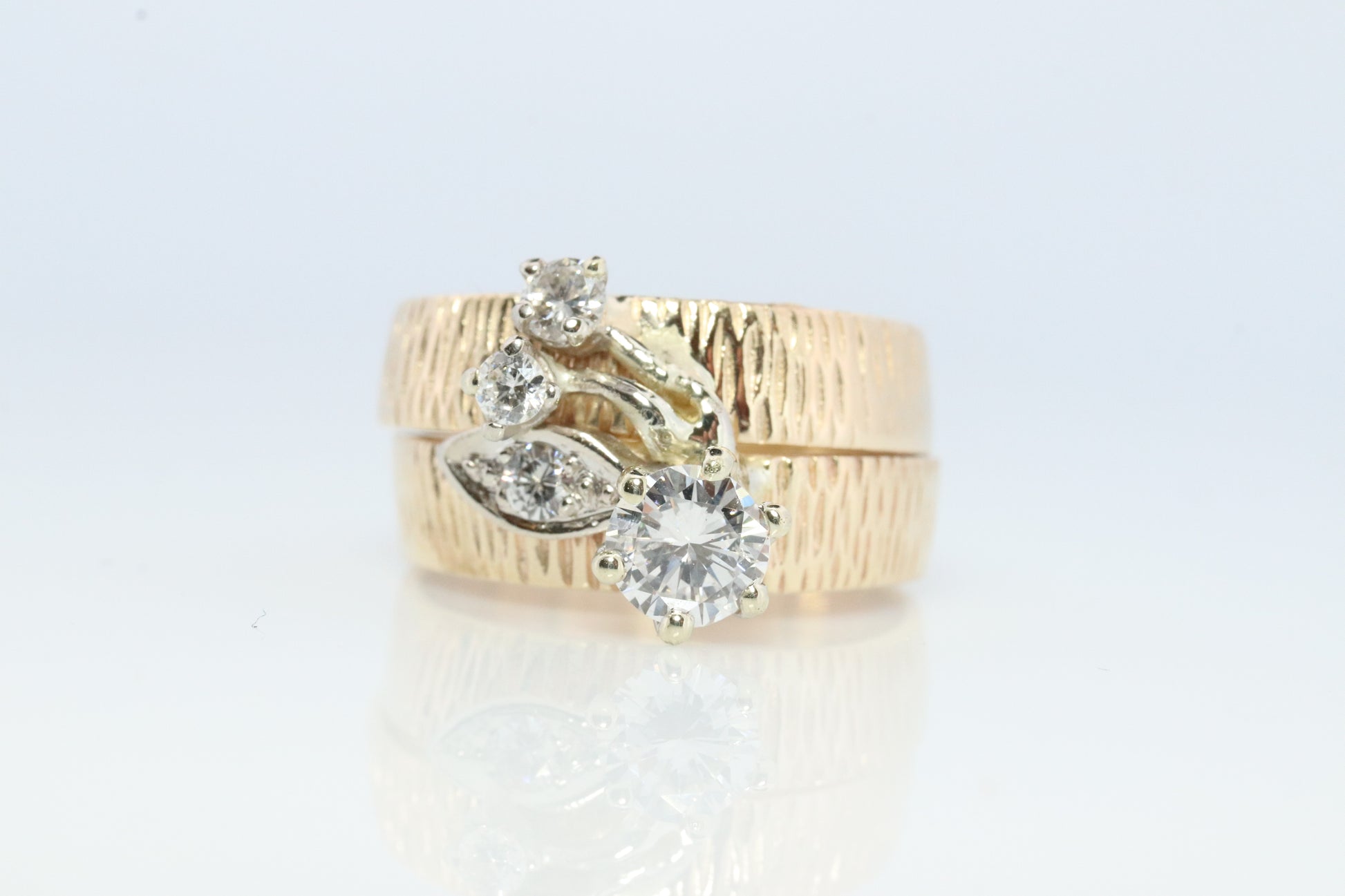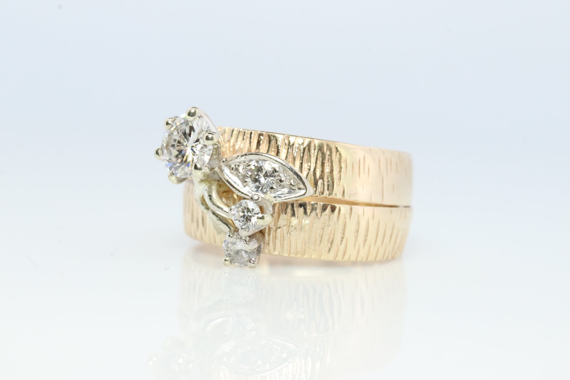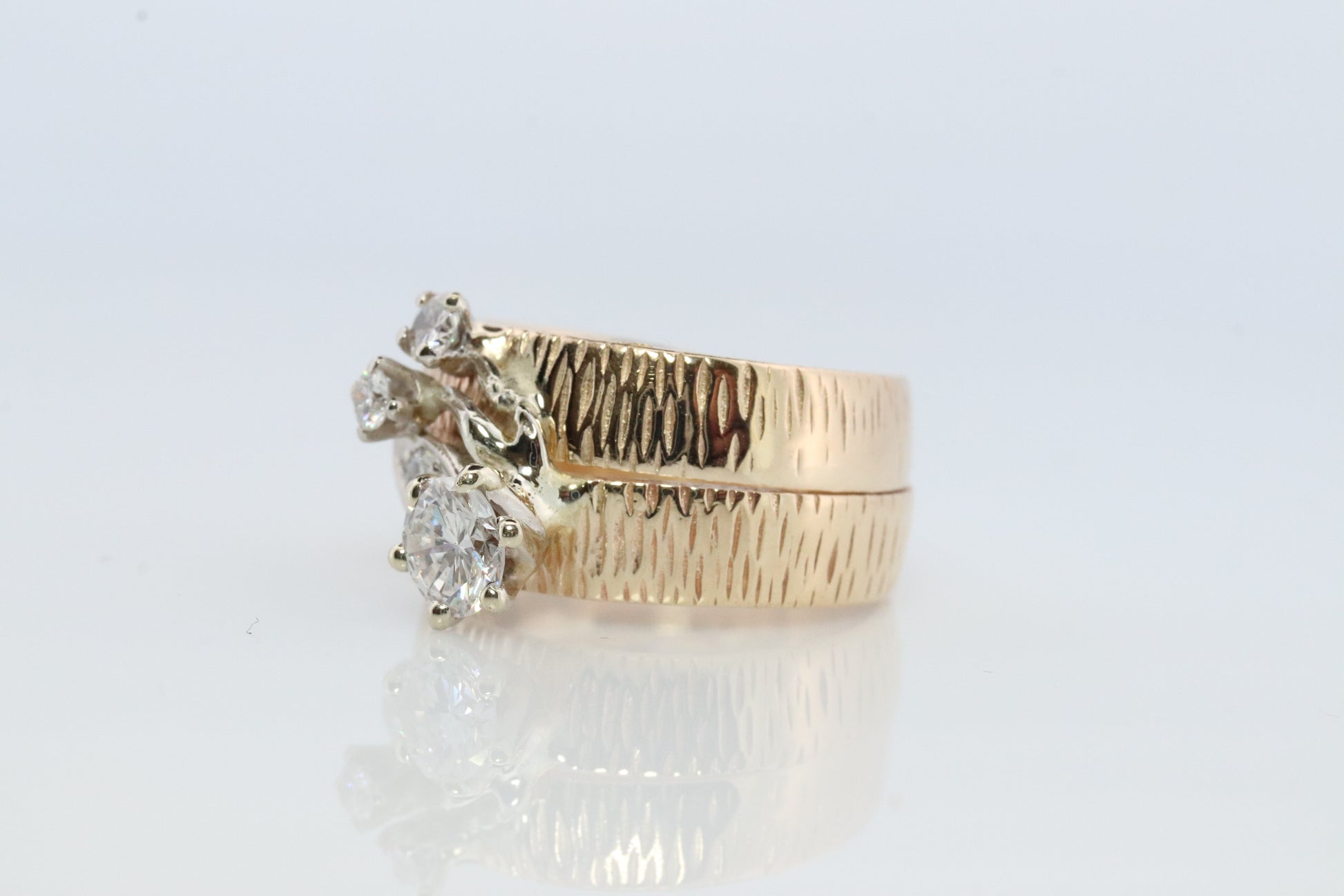14 Karat strukturiertes Gelbgold. Die Ringe sind am Schaft angelötet, können aber bei Bedarf leicht getrennt werden. Die Diamanten sind in einer Ranke eingefasst, die sich vermischt